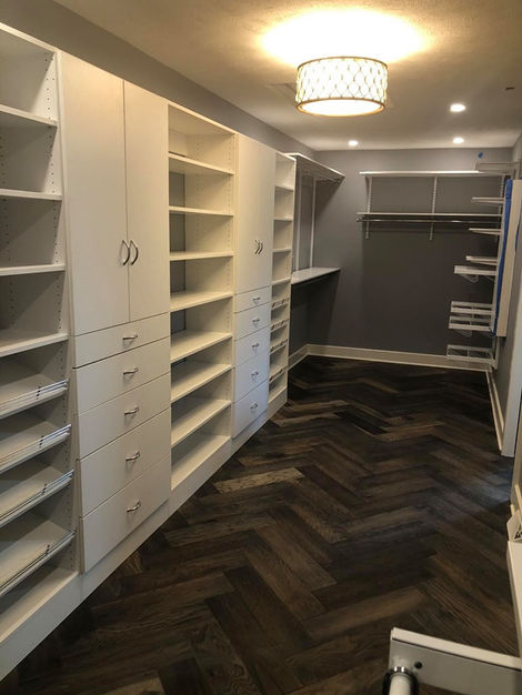 Built-in, semi-adjustable closet shelving featuring white laminate and satin nickel hardware